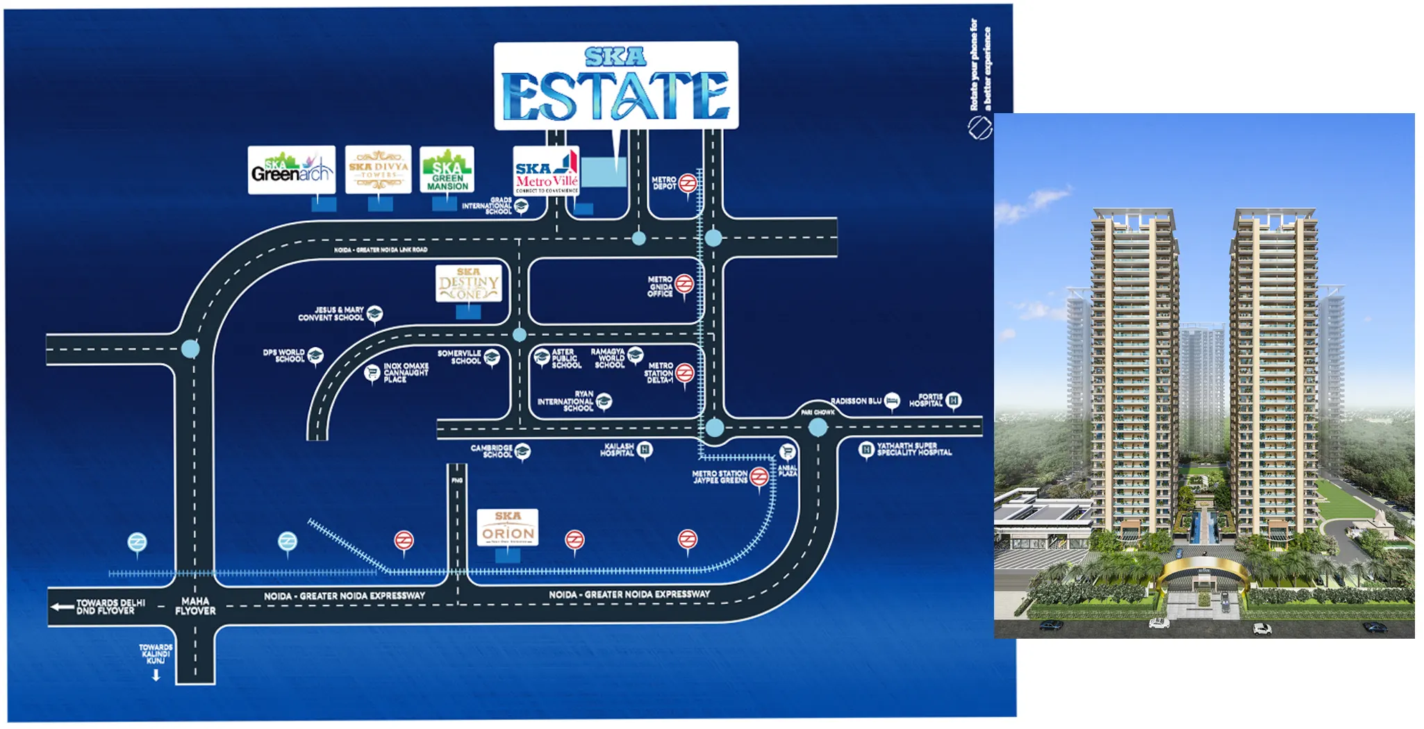 This development is nestled in the heart of Greater Noida and enjoys excellent connectivity. Greater Noida is seamlessly connected to Delhi and the rest of NCR through Noida- Greater Noida Expressway, Yamuna Expressway and the upcoming Delhi-Mumbai Industrial Corridor. Greater Noida is well-served by robust road and metro connectivity ensuring hassle-free commutation for the residents of Ska Eta 2 Greater Noida Project. The upcoming Jewar International Airport will further boost the area’s appeal. The project enjoys proximity to important landmarks including prominent schools, malls, markets, entertainment hubs, IT hubs and hospitals making it appealing for families and professionals alike.